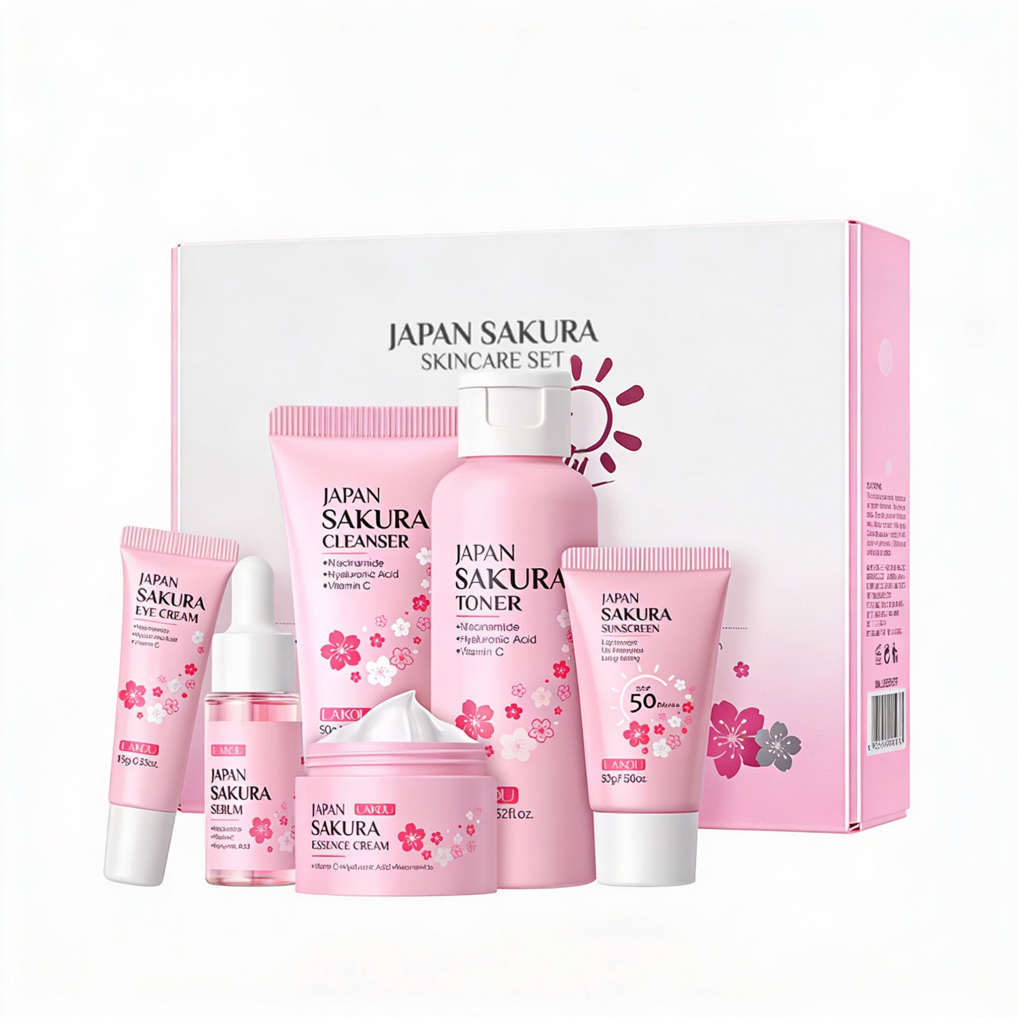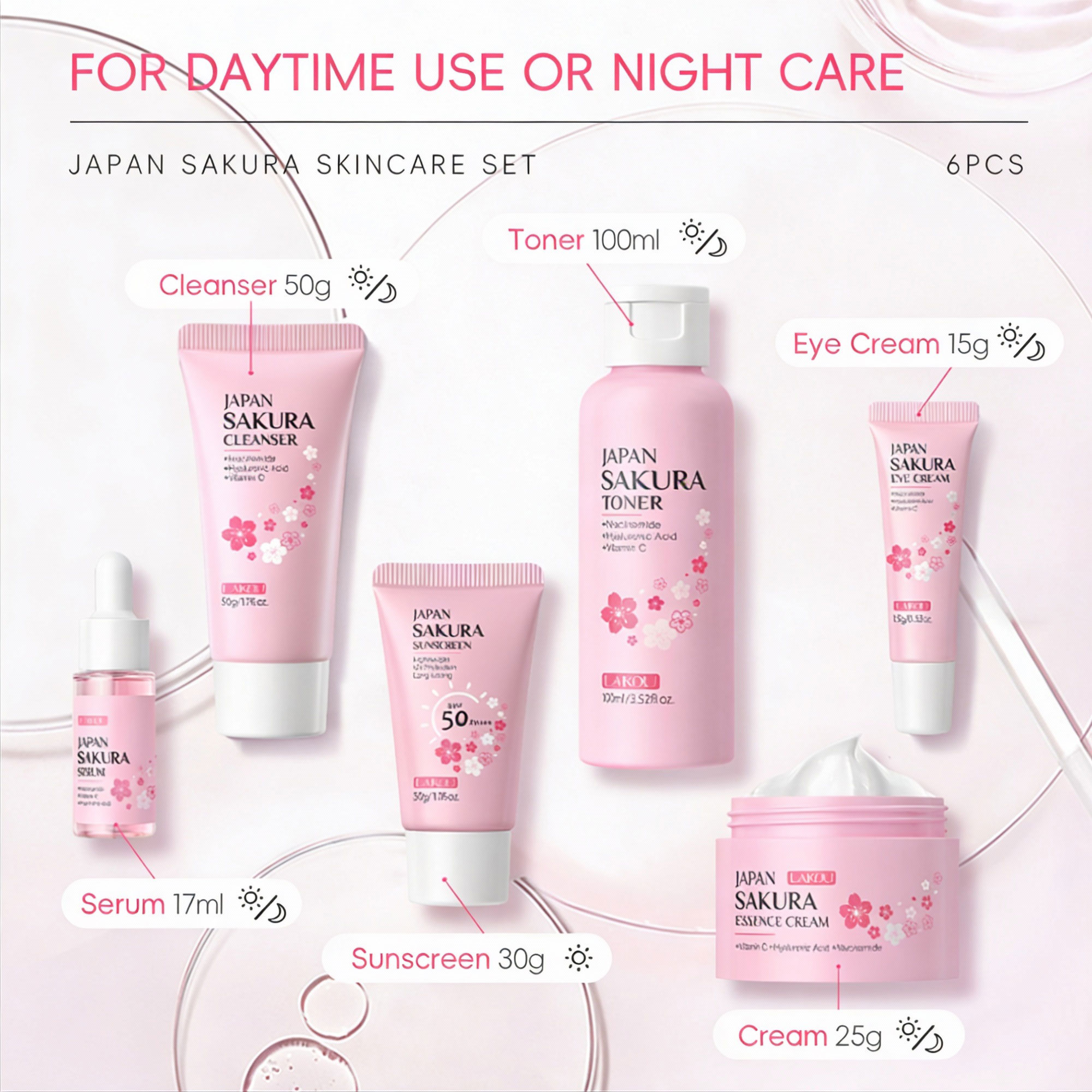 جموعة ساكورا للعناية بالبشرة، 6 قطع، تتضمن سيروم، غسول، تونر، كريم للوجه، كريم للعين، مرطب ليلي نهاري، وكريم واقٍ من الشمس، تحتوي على فيتامين سي ونياسيناميد