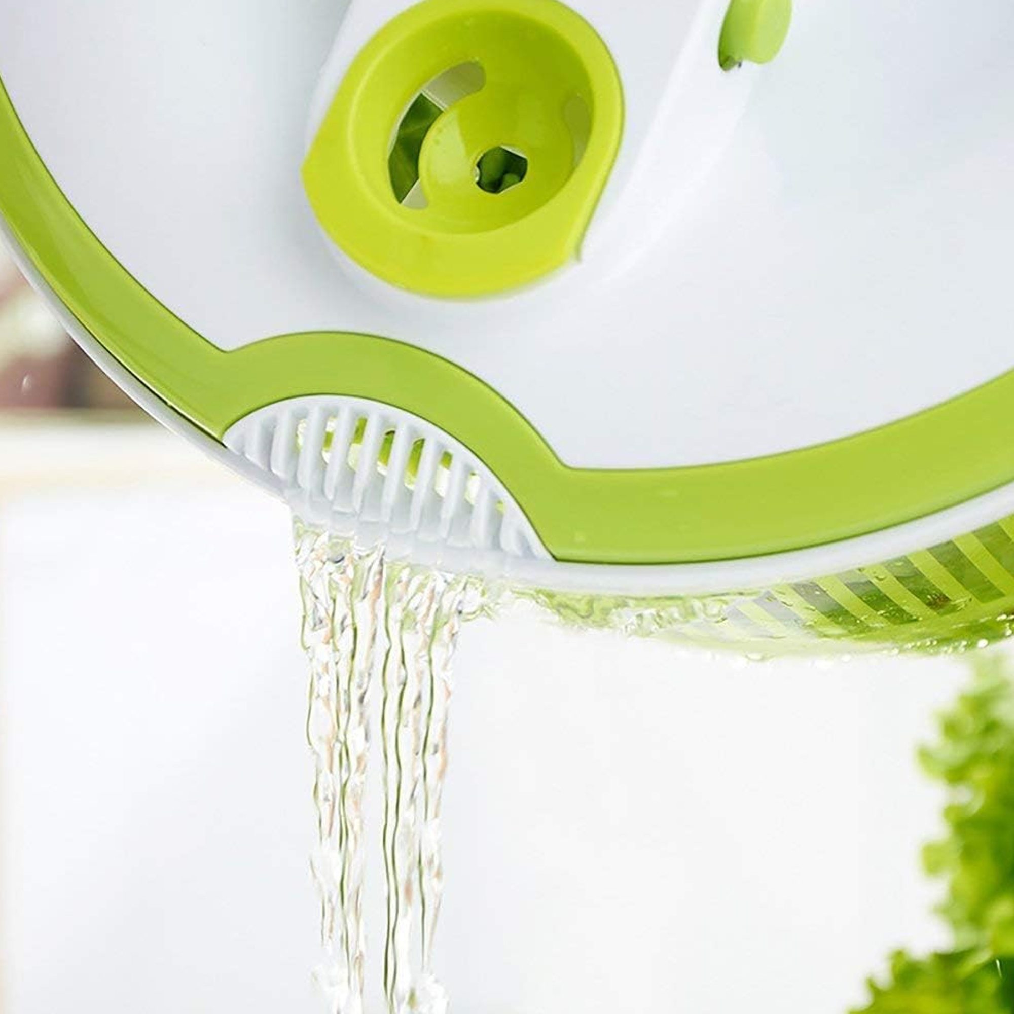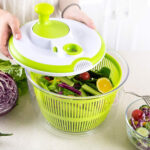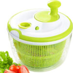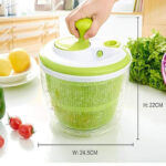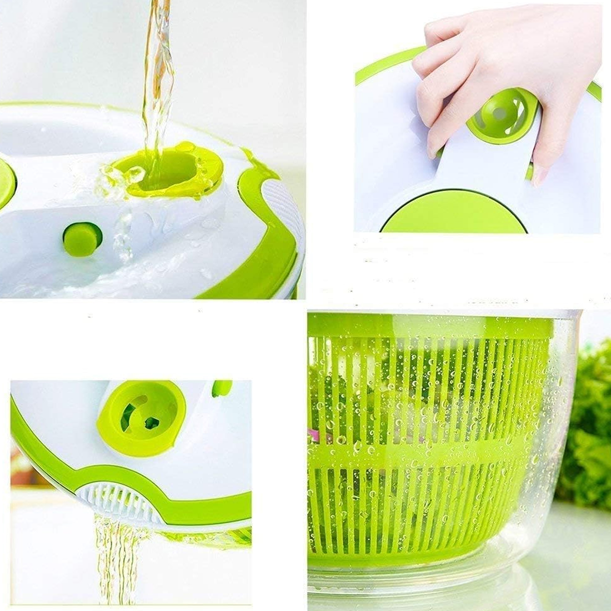 تحط الخضروات أو الفواكه داخل السلة، تشطفها بالماء، ثم تستخدم مقبض التدوير لتجفيفها بسرعة، وبعدها تفرغ الماء بسهولة عبر نظام التصريف، ويمكن استخدام الوعاء للتقديم مباشرة.